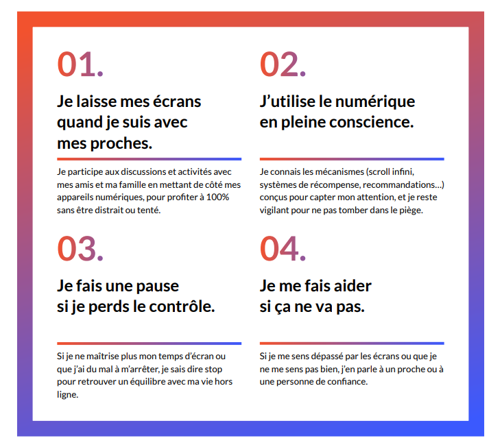 Aider les jeunes à comprendre comment leurs pratiques numériques, les contenus qu’ils consultent et leurs interactions en ligne affectent leur bien-être, et leur donner des clés d’un rapport plus équilibré et épanouissant face aux écrans.